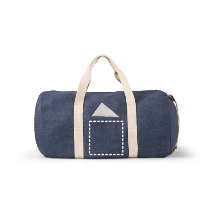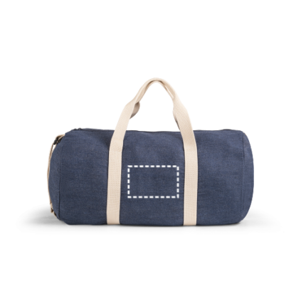 Recycled denim sports or travel bag (270 g/m²). Contains front pocket, double zipper and reinforced seams. It has cotton webbing handles and adjustable shoulder strap. Ø260 x 480 mm
