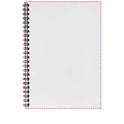 This A4 notebook includes a white or black wire, 80 g/m2 blank paper, and a glossy card front and back cover (250 g/m2). The standard model is delivered with 50 sheets, but the notebook is also available with 80 sheets. Printing is possible on the sheets as well as the front and back covers.
