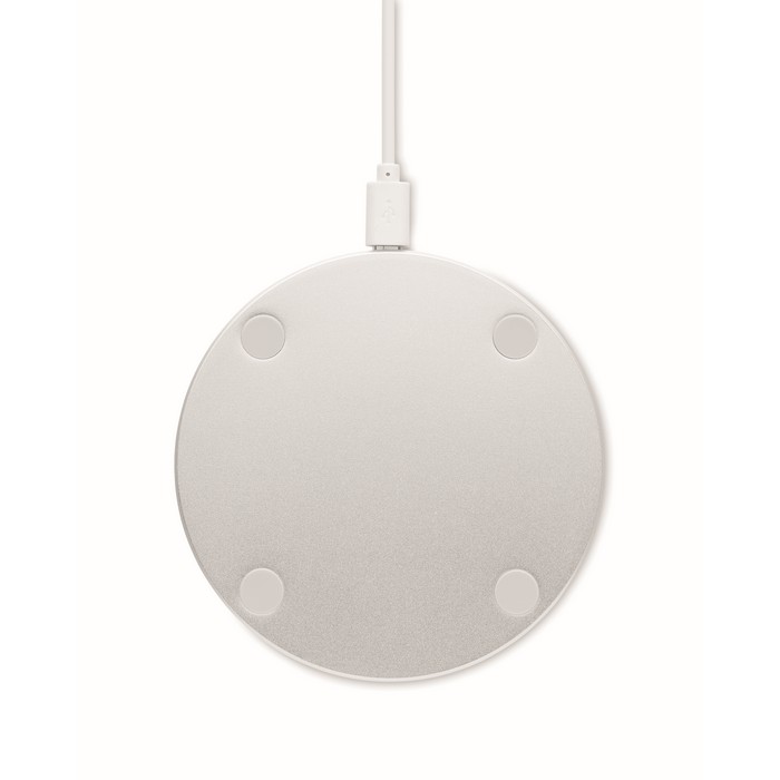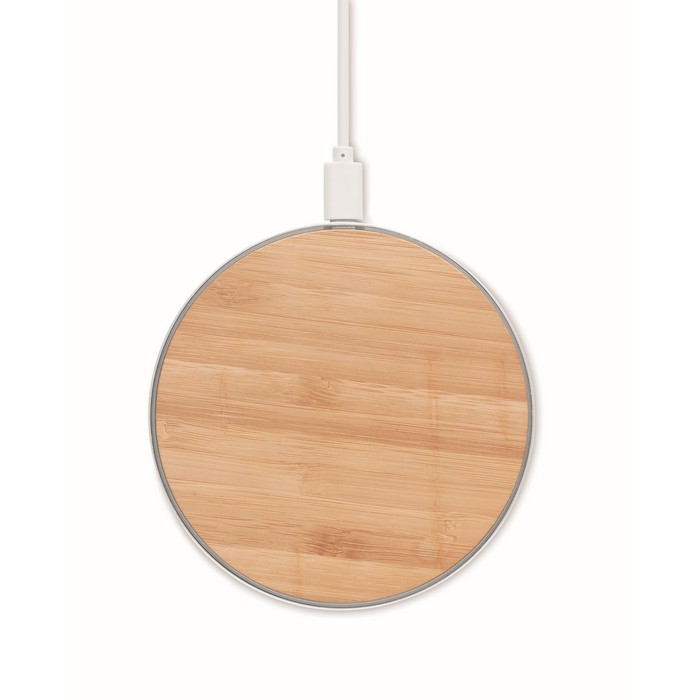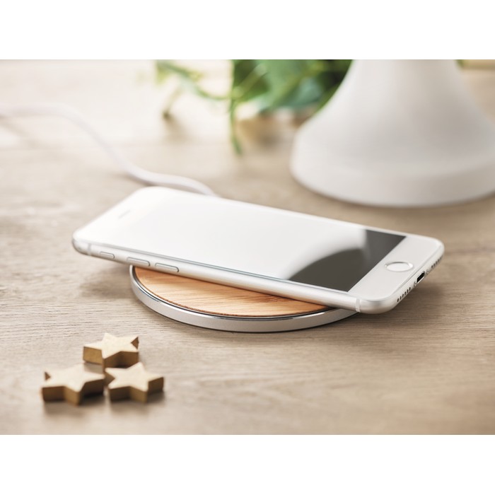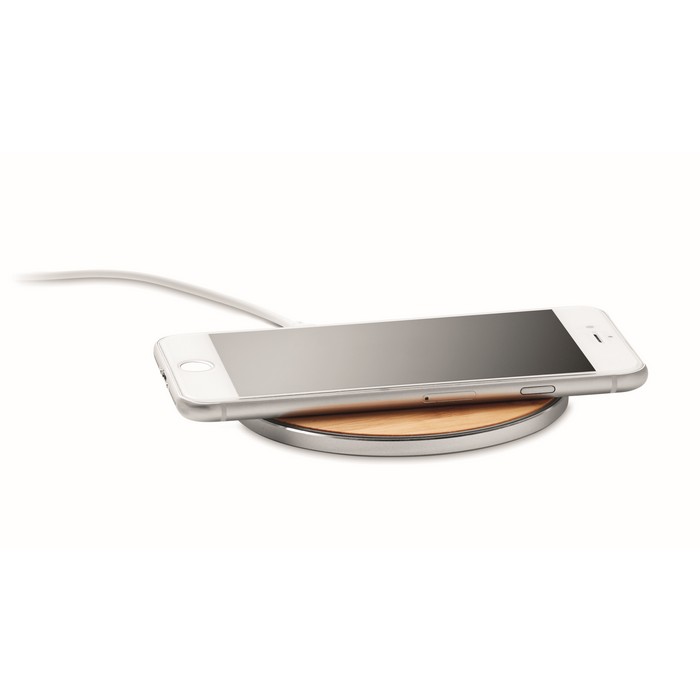 Wireless quick charger in bamboo and aluminium. Blue light lit when charging. Output: DC9V/1.1A (10W). Compatible with all QI enabled devices such as latest Androids, iPhone® 8, X and newer. Bamboo is a natural product, there may be slight variations in colour and size per item, which can affect the final decoration outcome.