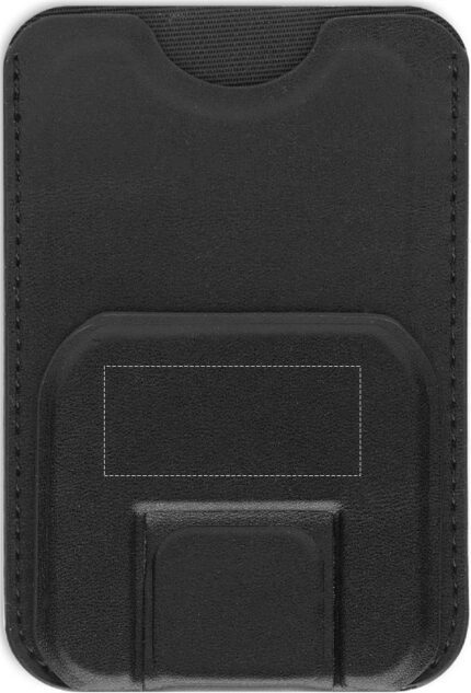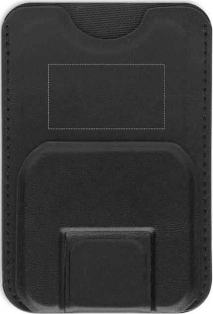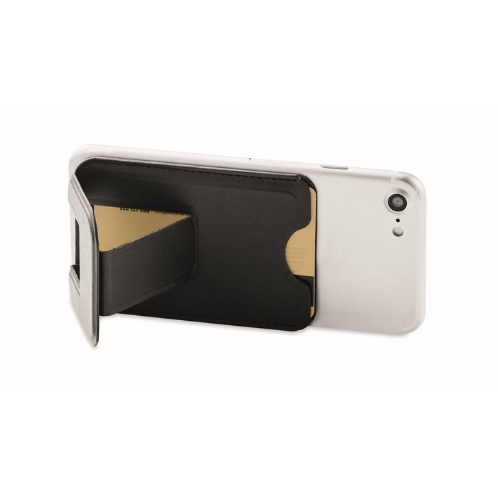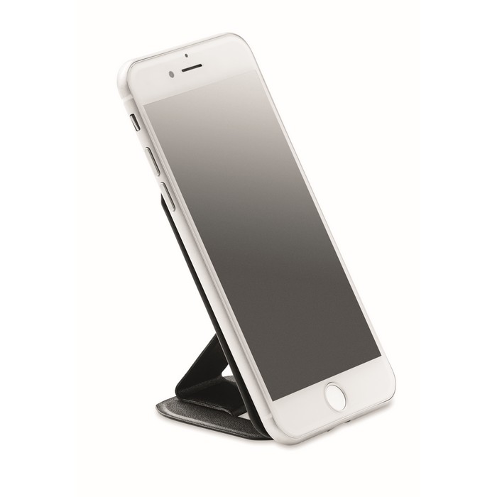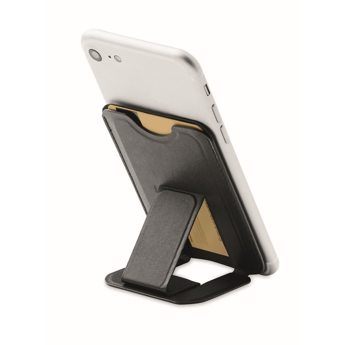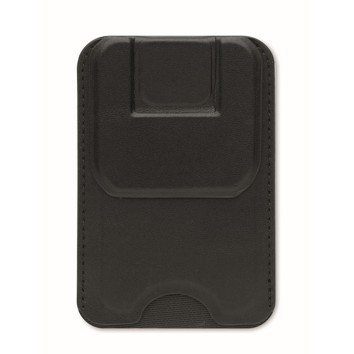 Credit card holder in PU with magnetic closure and phone stand functionality with 3M tape on the reverse side.
