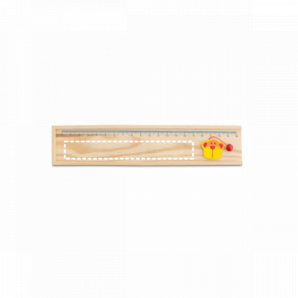 Drawing set supplied in wooden box. Includes a 20 cm ruler, 6 colouring pencils, 1 graphite pencil, a sharpener and an eraser. 220 x 43 x 32 mm