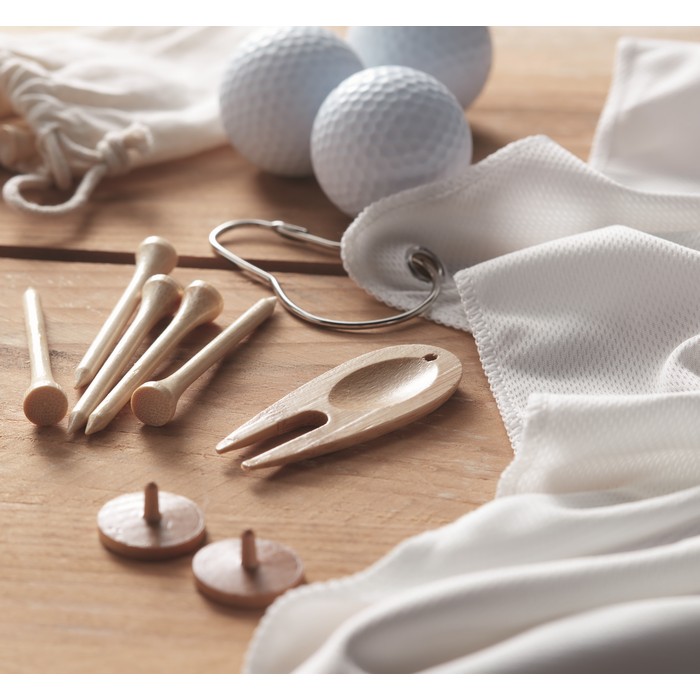 Golf accessories in bamboo including 6 golf tees, 1 piece golf divot and 2 golf wooden ball markers all presented in an organic cotton drawstring bag.
