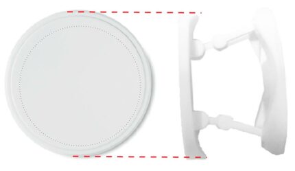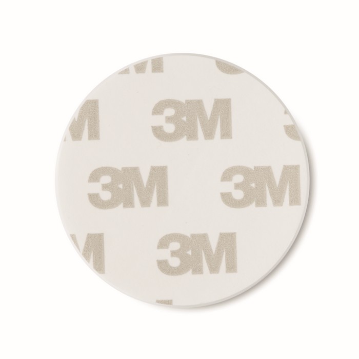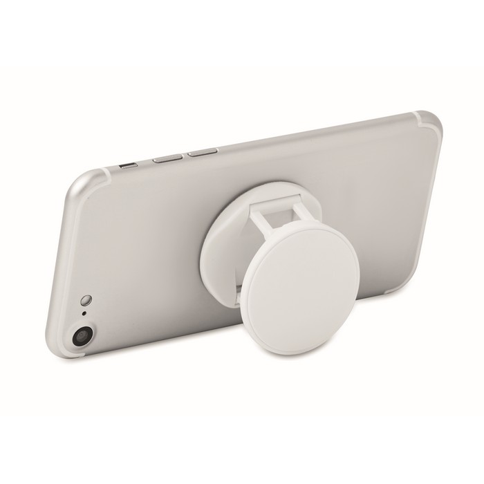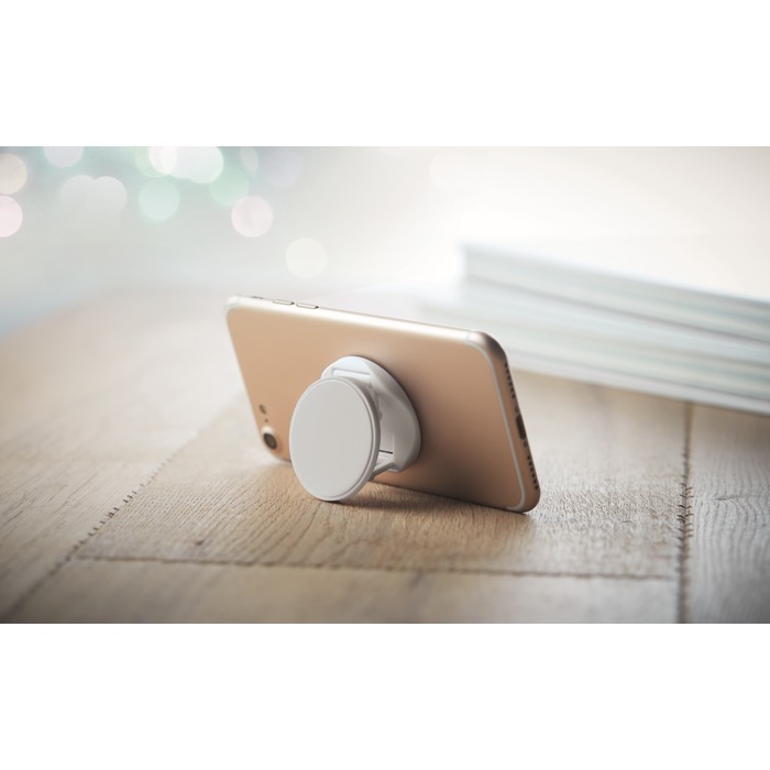 Round shaped foldable phone accessory in ABS with two functions: phone stand and holder. It has 3M sticker on the back.