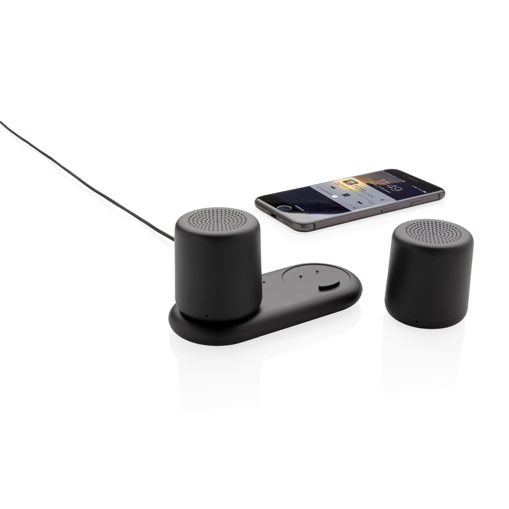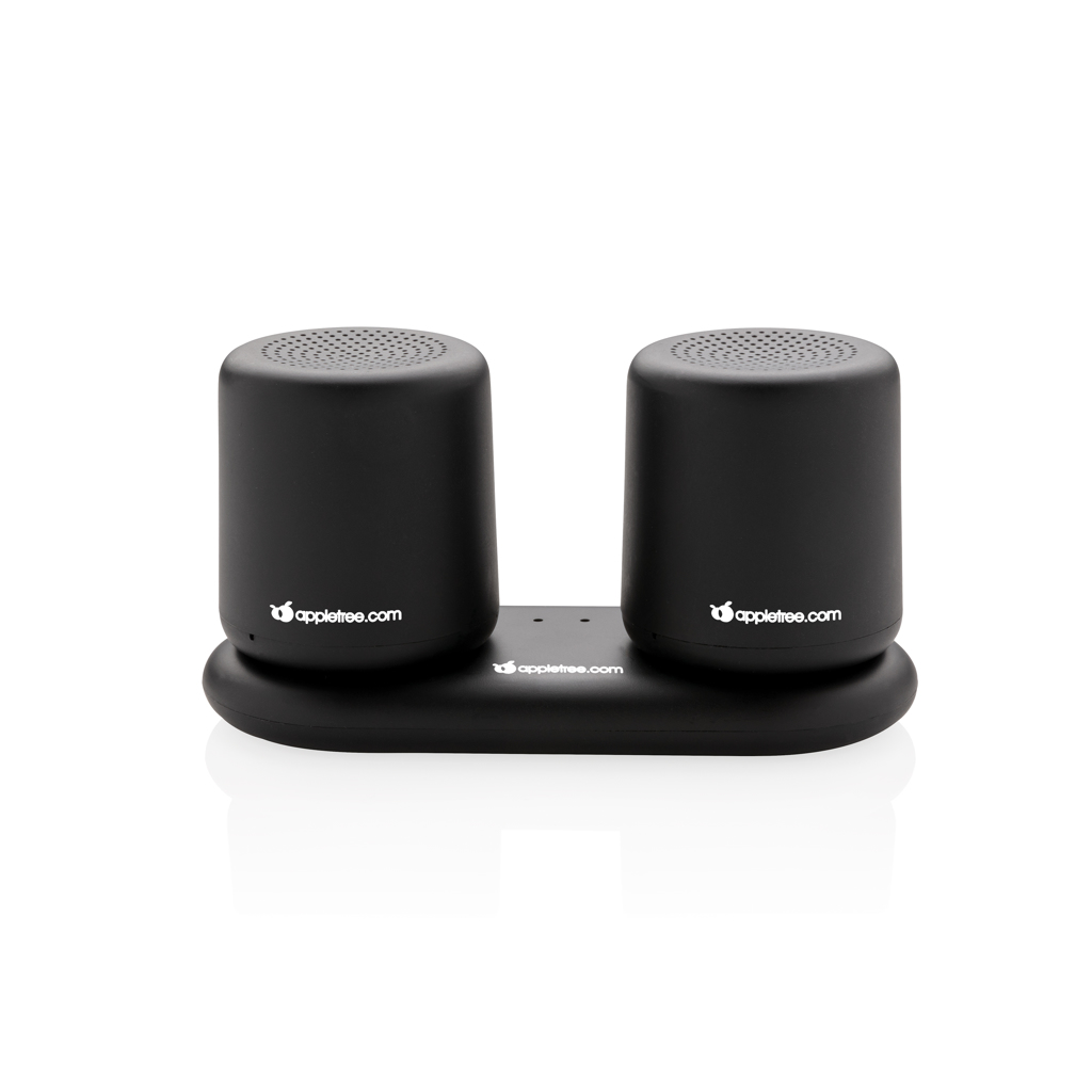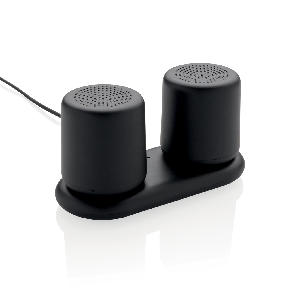 2X 3W speakers that can be paired for great stereo sound. Place the speakers anywhere you like for a great sound experience. The ABS speakers can be charged by simply placing them on the charging base. No need to connect any wires! Both speakers come equipped with a 300 mAh battery that allows a play time up to 2 hours. BT 4.2 for operating distance up to 10 metres. Including 120 cm micro USB cable to place the base on your desk or table.