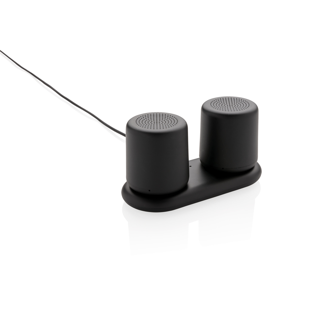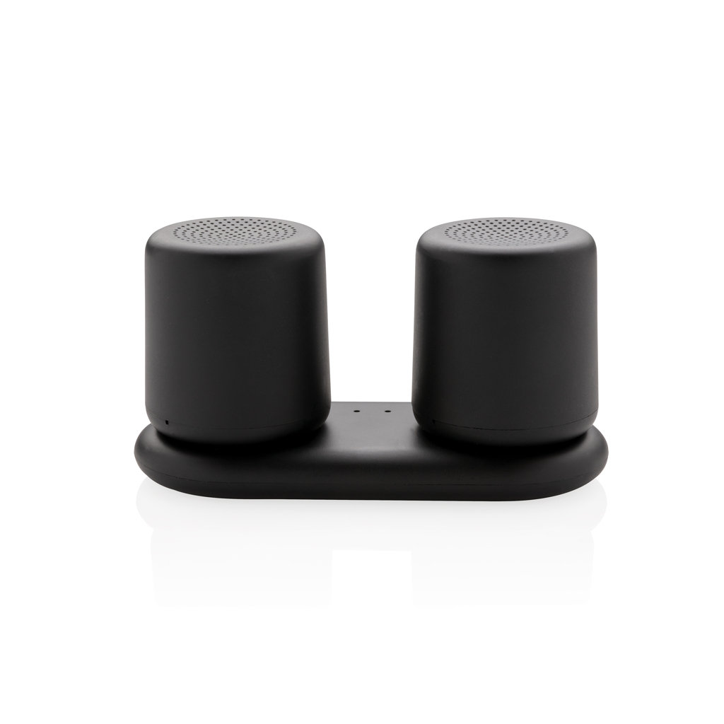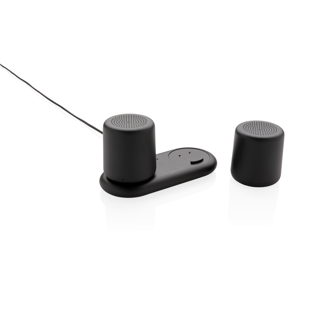2X 3W speakers that can be paired for great stereo sound. Place the speakers anywhere you like for a great sound experience. The ABS speakers can be charged by simply placing them on the charging base. No need to connect any wires! Both speakers come equipped with a 300 mAh battery that allows a play time up to 2 hours. BT 4.2 for operating distance up to 10 metres. Including 120 cm micro USB cable to place the base on your desk or table.