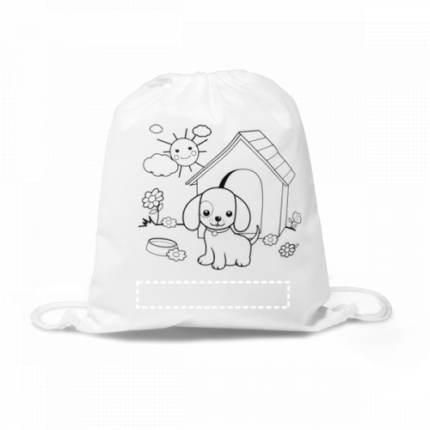 Non-woven drawstring bag (80 m/g²) with childrens drawing to colour. This product is supplied with 4 markers. Ideal set to offer to occupy kids. 300 x 350 mm