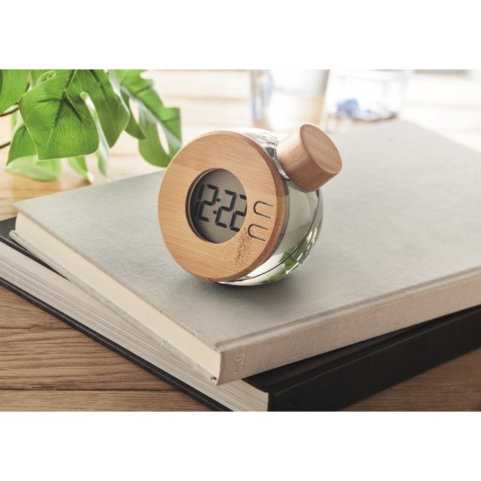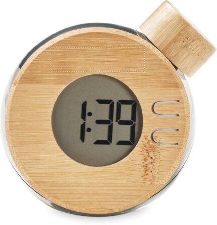 Large display LCD clock with bamboo details. No battery is necessary to power this product, only water and 3gr salt.
