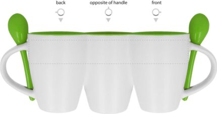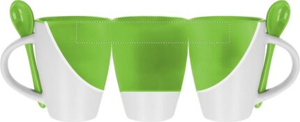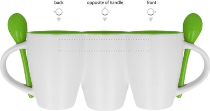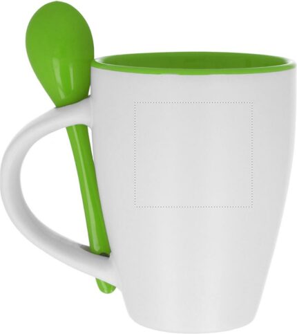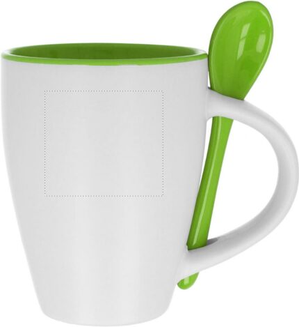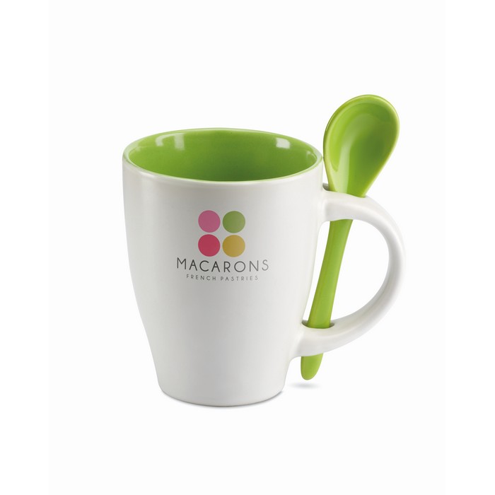Bicolour ceramic coffee mug of 250 ml capacity with colour matching spoon. Individual box 11,5×10,5×9,3cm.