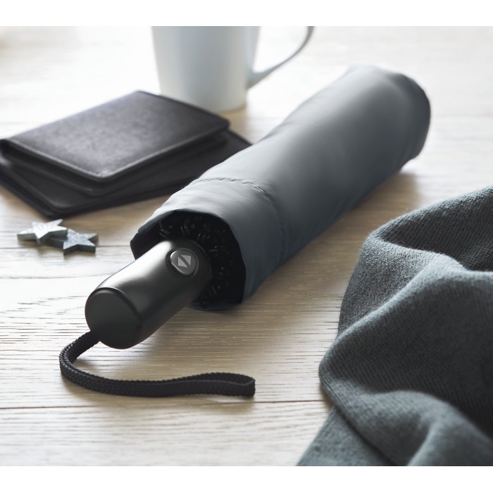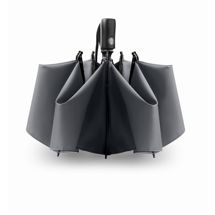 23 inch 3 fold auto open/close reversible umbrella in 190T pongee material chrome plating steel shaft. Fibre-glass rib and 1 part black plating inside frame. Black ABS handle with button. Includes matching pouch.