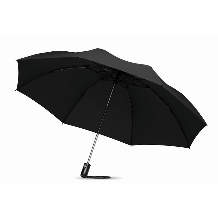 23 inch 3 fold auto open/close reversible umbrella in 190T pongee material chrome plating steel shaft. Fibre-glass rib and 1 part black plating inside frame. Black ABS handle with button. Includes matching pouch.