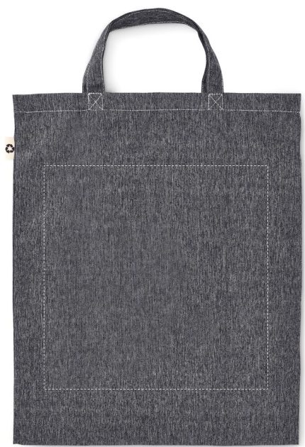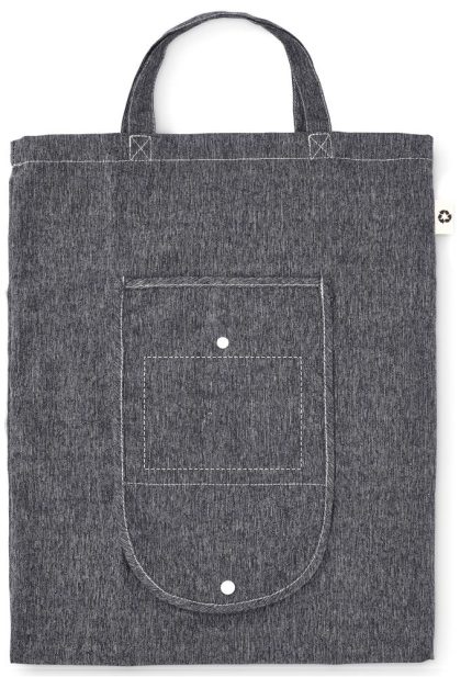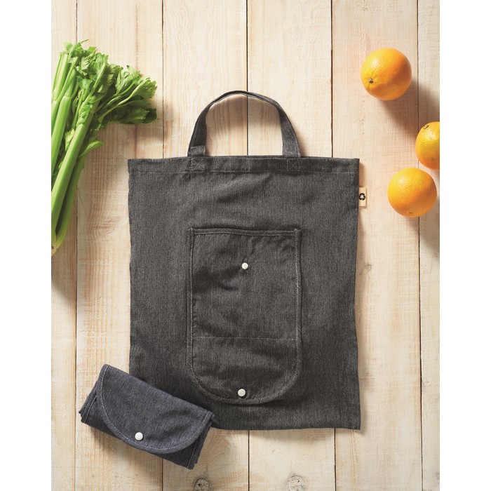 Foldable 2 tone recycled cotton and recycled polyester shopping bag with long handles. Approx. 140 gr/m². This item can shrink after printing.