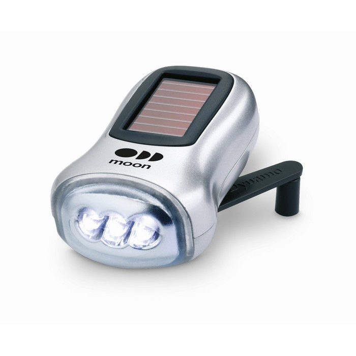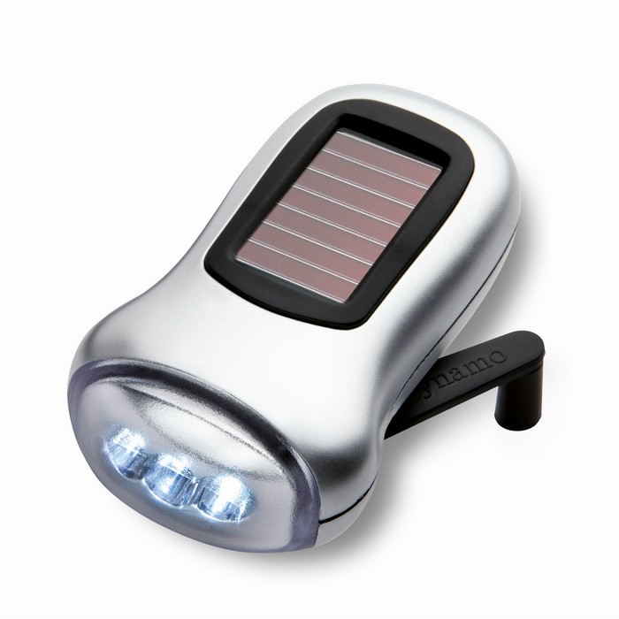 Torch powered both by solar panel and dynamo. ABS casing with satin silver spray.