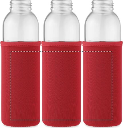 Recycled glass bottle with neoprene pouch and PP lid with silicone hanger. Leak free. Capacity: 500 ml.