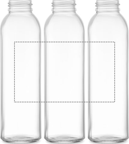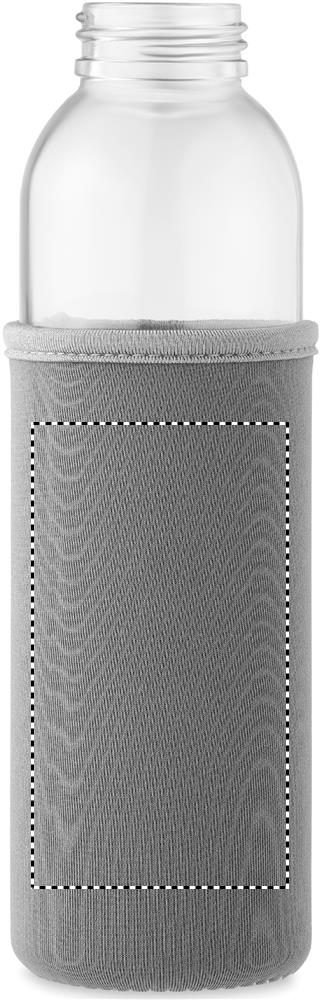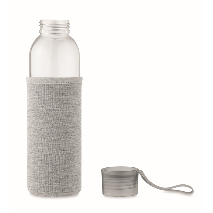 Recycled glass bottle with neoprene pouch and PP lid with silicone hanger. Leak free. Capacity: 500 ml.