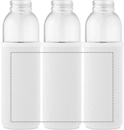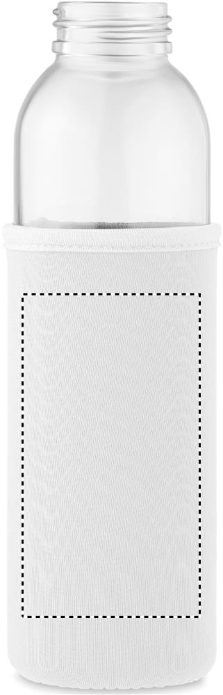 Recycled glass bottle with neoprene pouch and PP lid with silicone hanger. Leak free. Capacity: 500 ml.