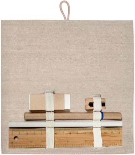 6 pieces stationery set. Include jute and cotton pouch, bamboo ruler, wooden sharpener, eraser, paper pencil, ball pen with cardboard barrel and blue ink.