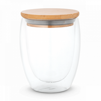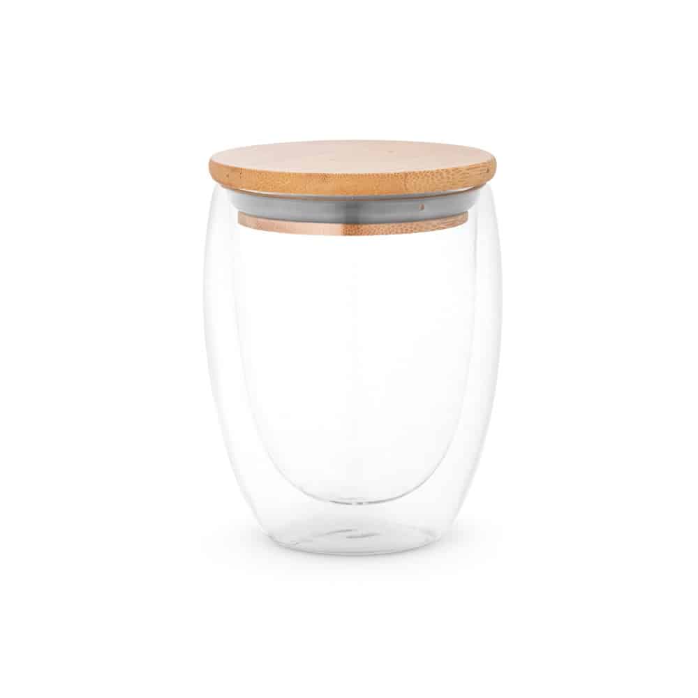 Double wall air-insulated borosilicate glass travel cup with bamboo lid. Cup with a capacity of up to 350 mL, ideal for cold or hot liquids. The silicone-insulated lid prevents spillages during transportation. Microwave and dishwasher safe, when the lid is removed. Supplied in a kraft paper gift box. ø91 x 119 mm