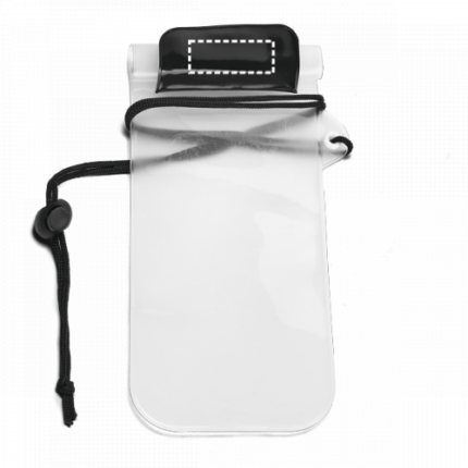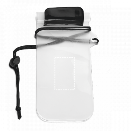 Waterproof phone bag in PVC with adjustable strap and spring lock. Clear on the front and matte white on the back. It allows the user to interact with the screen from the outside. The bag has an airtight closure and colourful flap with a self-adhesive hook and loop fastener. 95 x 240 mm