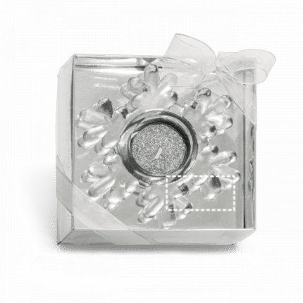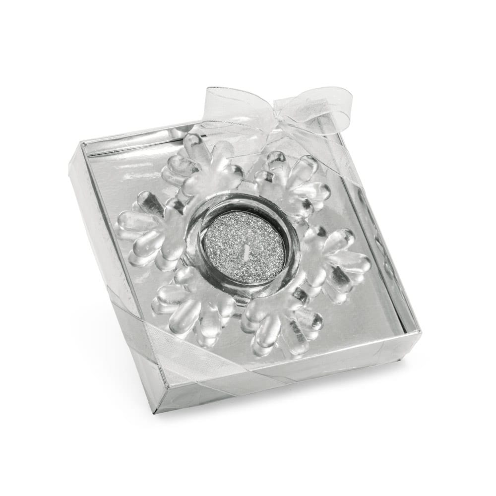 Candle in snowflake-shaped glass base. Gift box included. Box: 123 x 123 x 30 mm