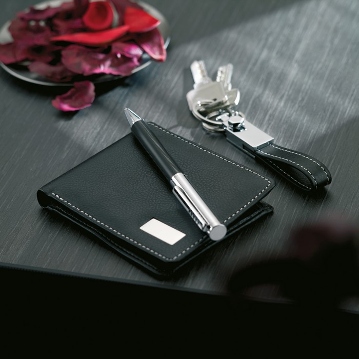Elegant gift set presented on an EVA tray and carton box. Includes a twist ball pen with blue ink refill, a metal key ring with PU loop and a PU wallet. All PU finish with contrasted stitching.