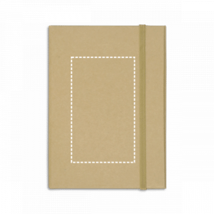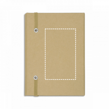 Office set with notepad (160 recycled pages), 6 sets of sticky notes (25 sheets each), 12 cm ruler, 1 ballpoint (kraft paper), business card holder and cardboard cover with elastic band. 110 x 153 mm