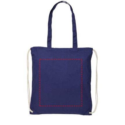 Multi-functional cotton bag with long handles and drawstring which can be carried as tote or backpack. Large main compartment with drawstring closure. Features two dropdown handles length of 31 cm. Capacity: 1.5 L, resistance up to 5 kg weight.