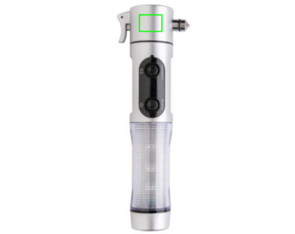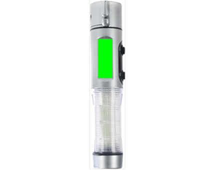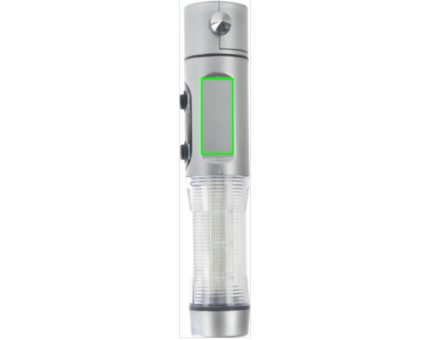 Emergency light, silver ABS case, 1 white LED and 9 red flash lights at side, cutter, window breaker and magnetic base to place on the roof of the car.