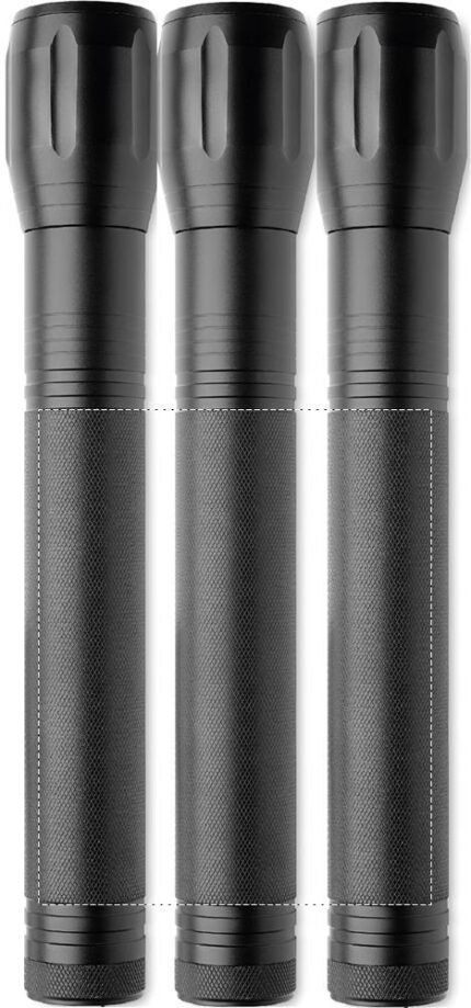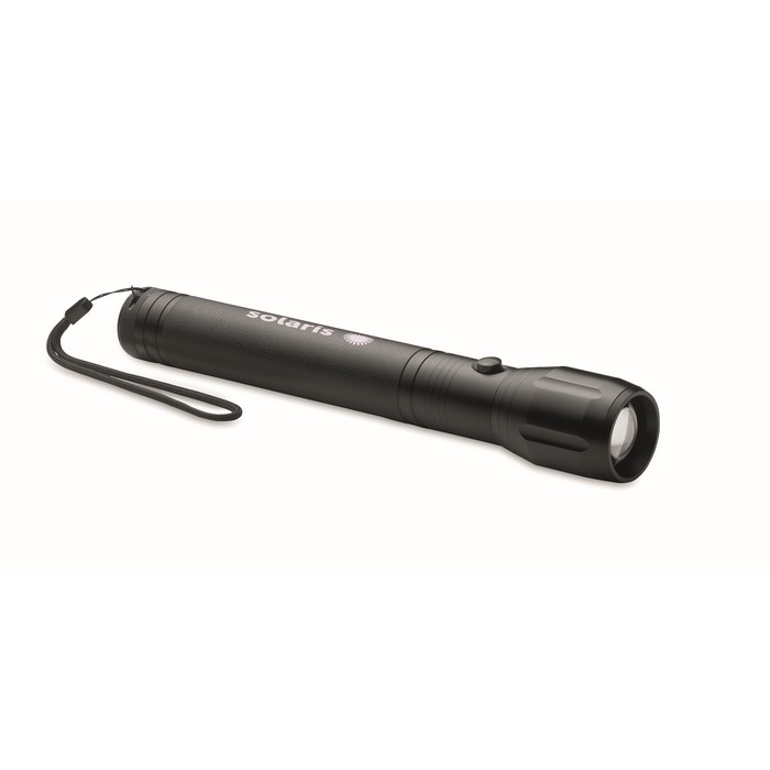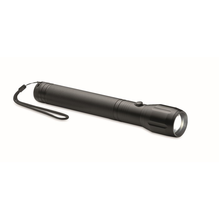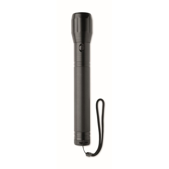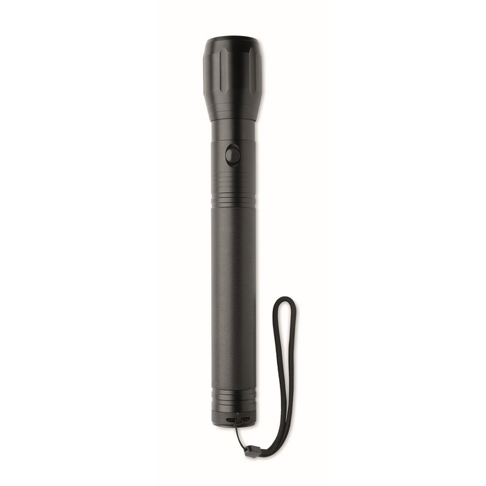 Large aluminium zoomable 1 LED flashlight torch and detachable strap. Output: 300 lumen. 3 D batteries excluded.