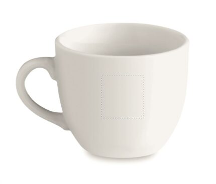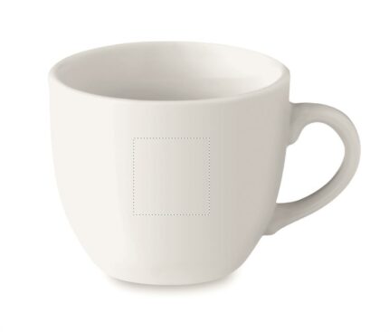 Porcelain espresso cup and saucer. Cup capacity: 80 ml. Bulk packaging. Pad printing is not dishwasher safe. Ceramic transfer is dishwasher safe.