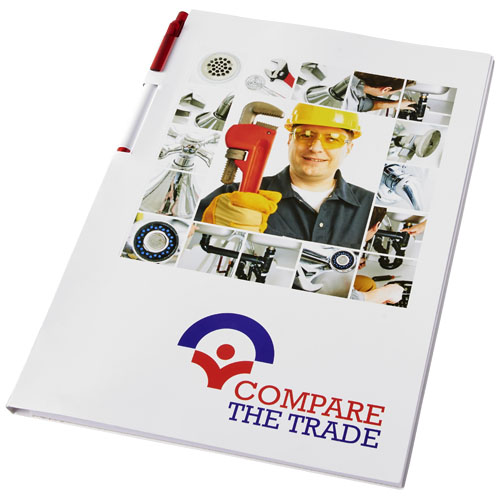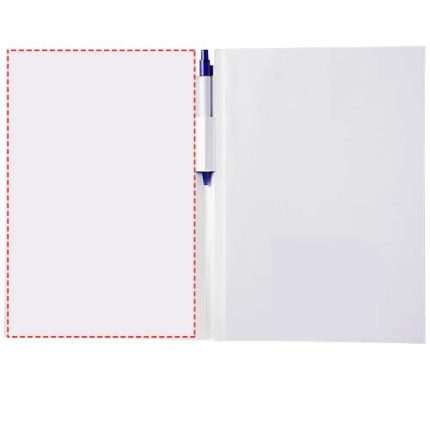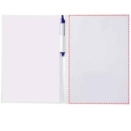 Essential conference pack A4. Includes an A4 notepad with 50 sheets (80g/m2) blank paper and a calypso pen in the spine area. The conference pack has a hard cover (350g/m2). Full colour decoration possible on both sides of the cover, as well as on each sheet.