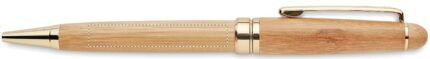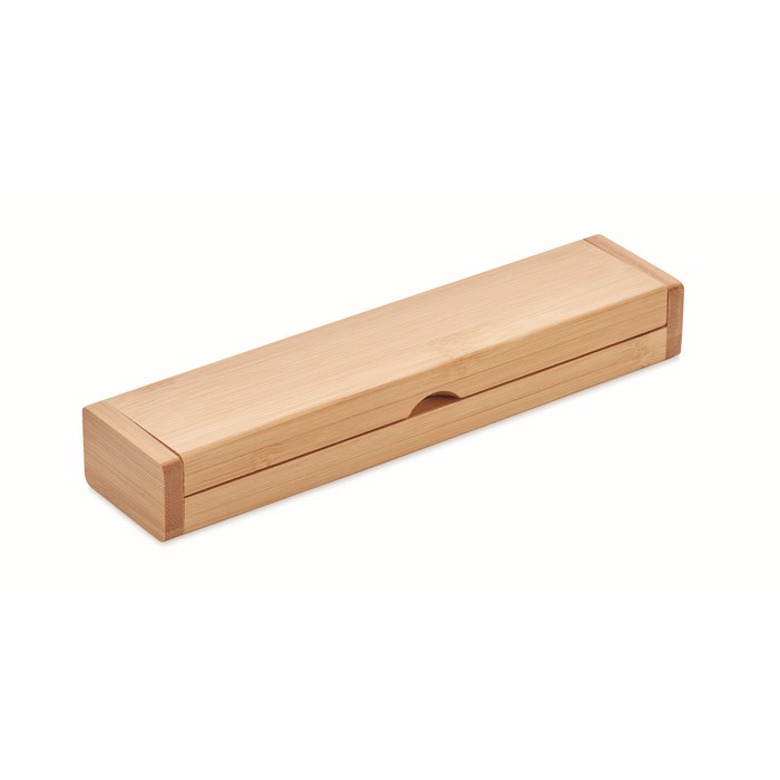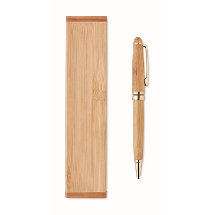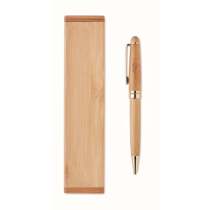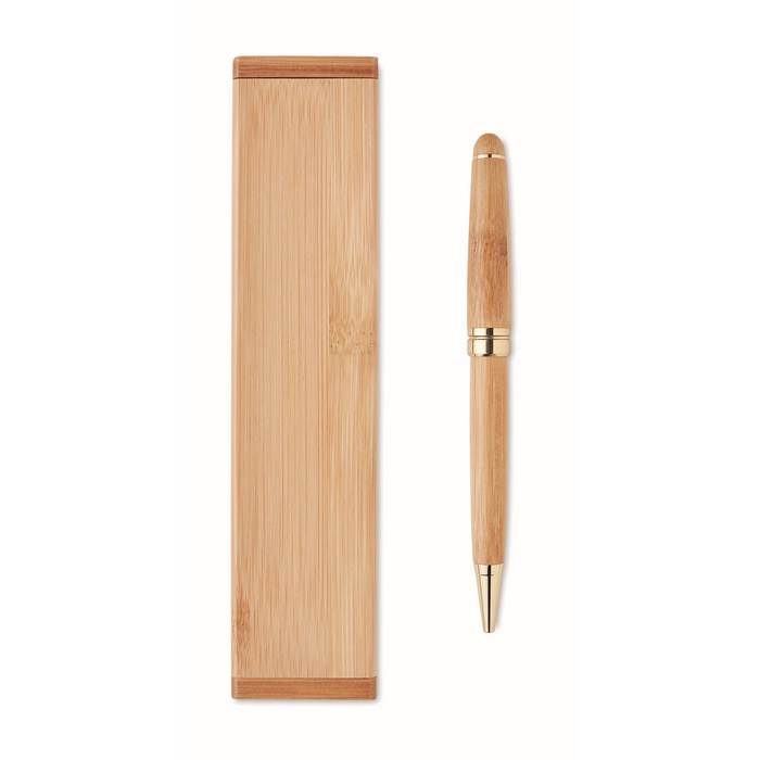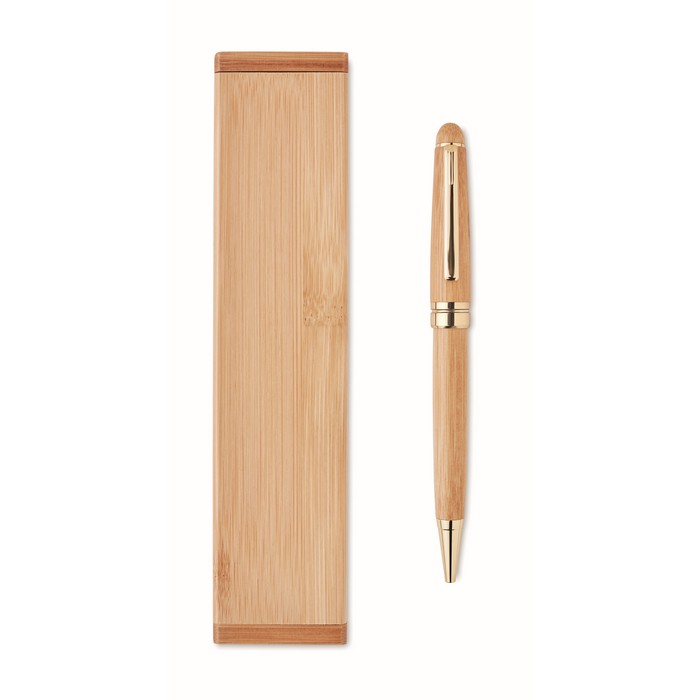 Gift set with twist ball pen in bamboo box. Blue ink. Bamboo is a natural product, there may be slight variations in colour and size per item, which can affect the final decoration outcome.
