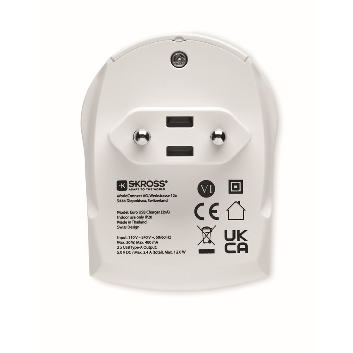 SKROSS® Euro USB Charger (2xA). European 2-pole charger with 2 UBS Type- A ports.
