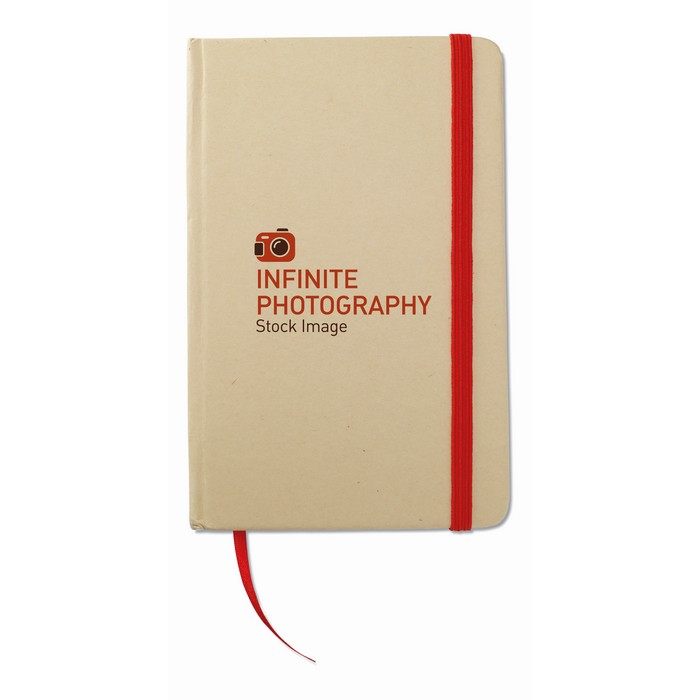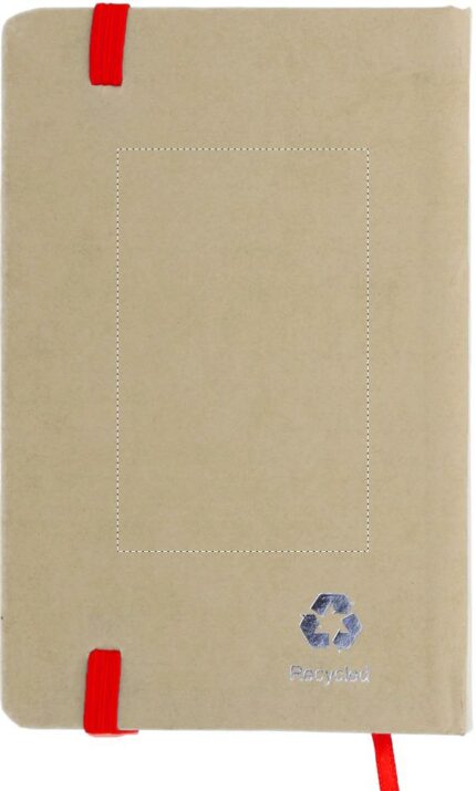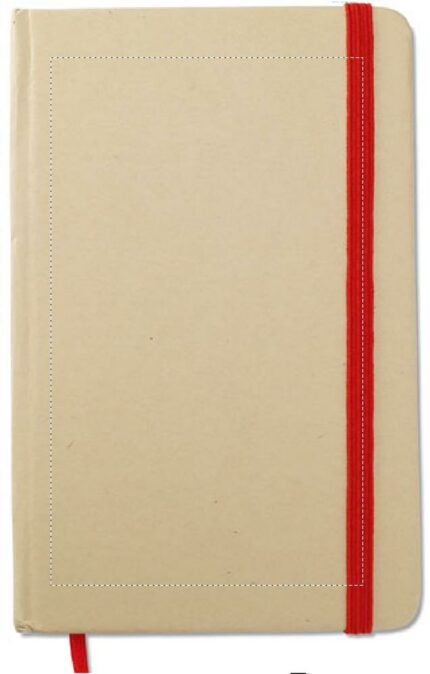 A6 recycled paper hard cover notebook. Casebound. 192 plain pages (96 sheets). Elastic closure strap and ribbon bookmark.