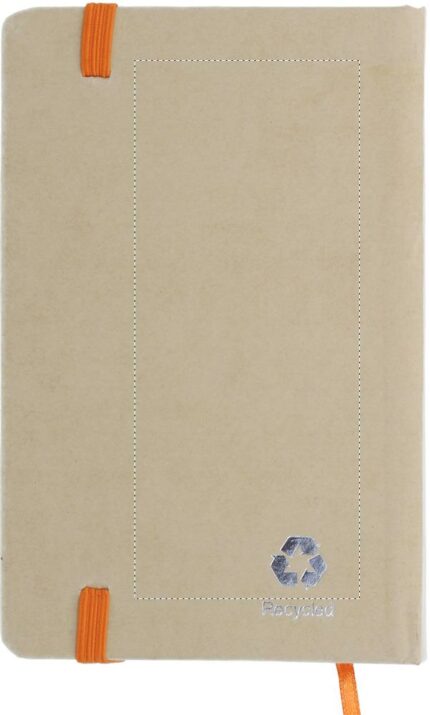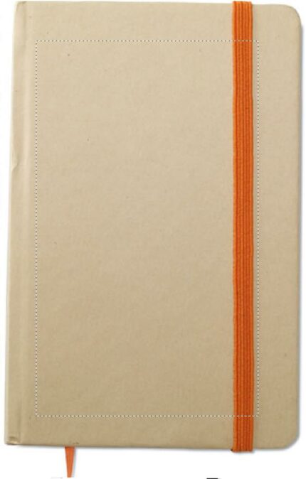 A6 recycled paper hard cover notebook. Casebound. 192 plain pages (96 sheets). Elastic closure strap and ribbon bookmark.
