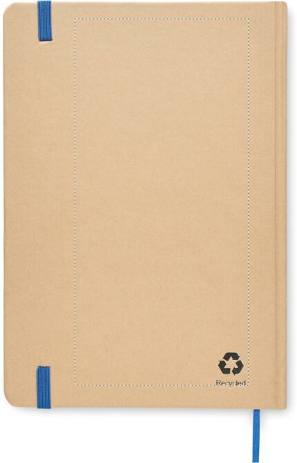 A5 notebook with hard recycled carton cover. Casebound. 160 squared recycled pages (80 sheets). Elastic closure strap, ribbon bookmark.