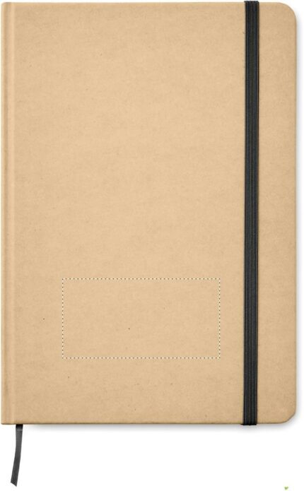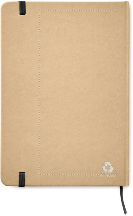 A5 notebook with hard recycled carton cover. Casebound. 160 lined pages (80 sheets). Elastic closure strap, ribbon bookmark.