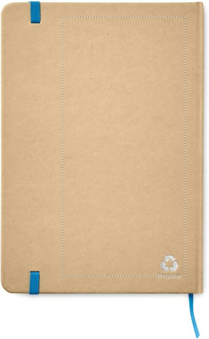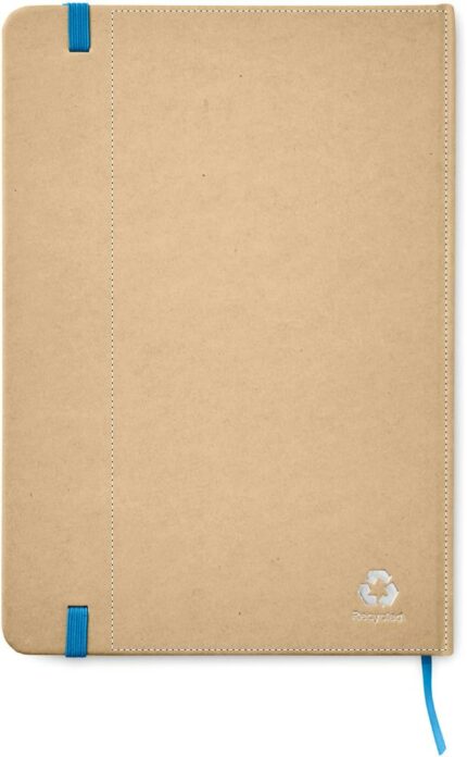 A5 notebook with hard recycled carton cover. Casebound. 160 lined pages (80 sheets). Elastic closure strap, ribbon bookmark.