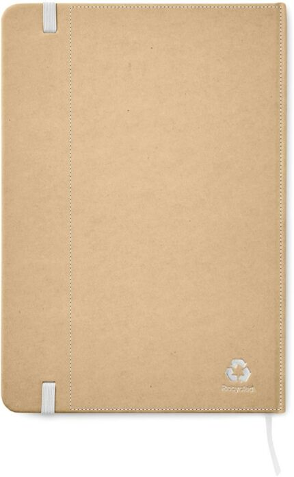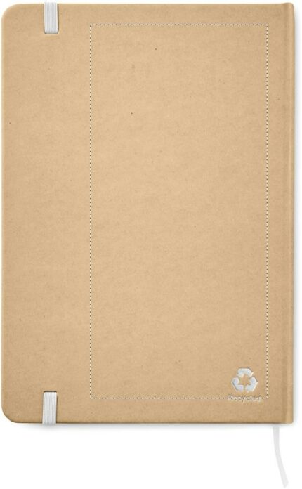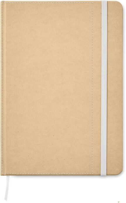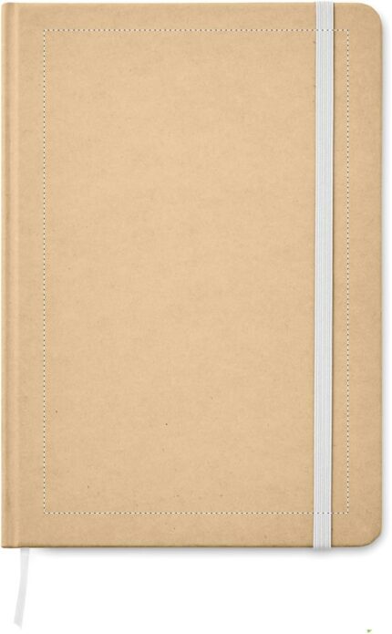 A5 notebook with hard recycled carton cover. Casebound. 160 lined pages (80 sheets). Elastic closure strap, ribbon bookmark.