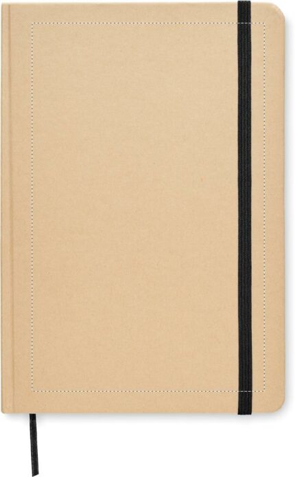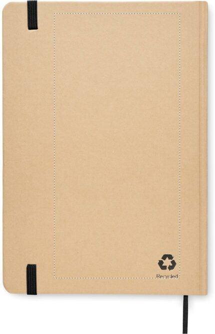 A5 notebook with hard recycled carton cover. Casebound. 160 squared recycled pages (80 sheets). Elastic closure strap, ribbon bookmark.