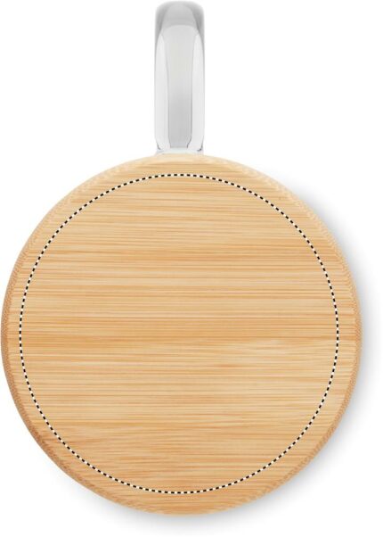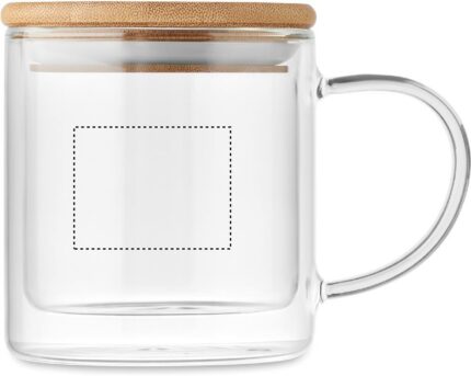 Double wall borosilicate glass mug with bamboo lid and colours handles. Capacity: 300 ml.