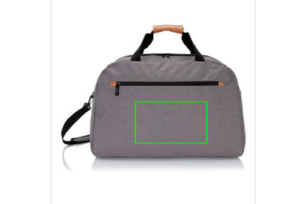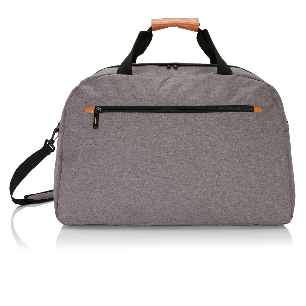 600D 2 tone polyester travel bag with fashionable brown details on the handles and zippers.