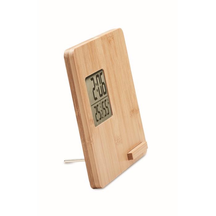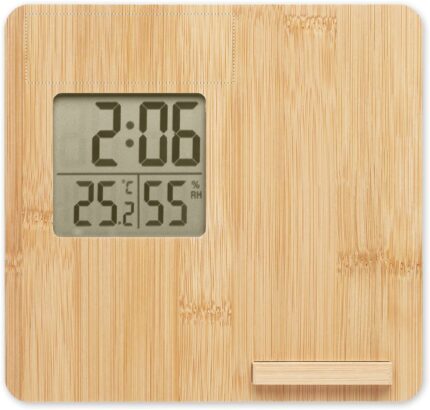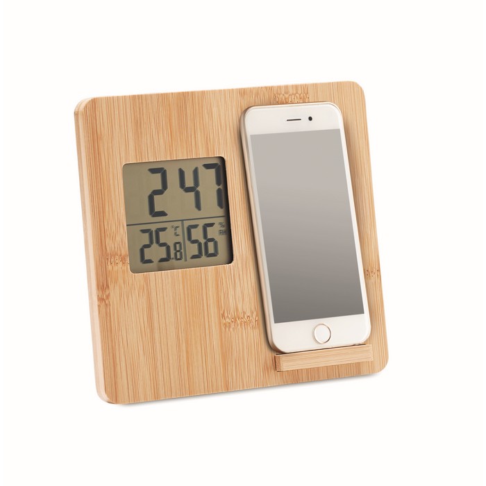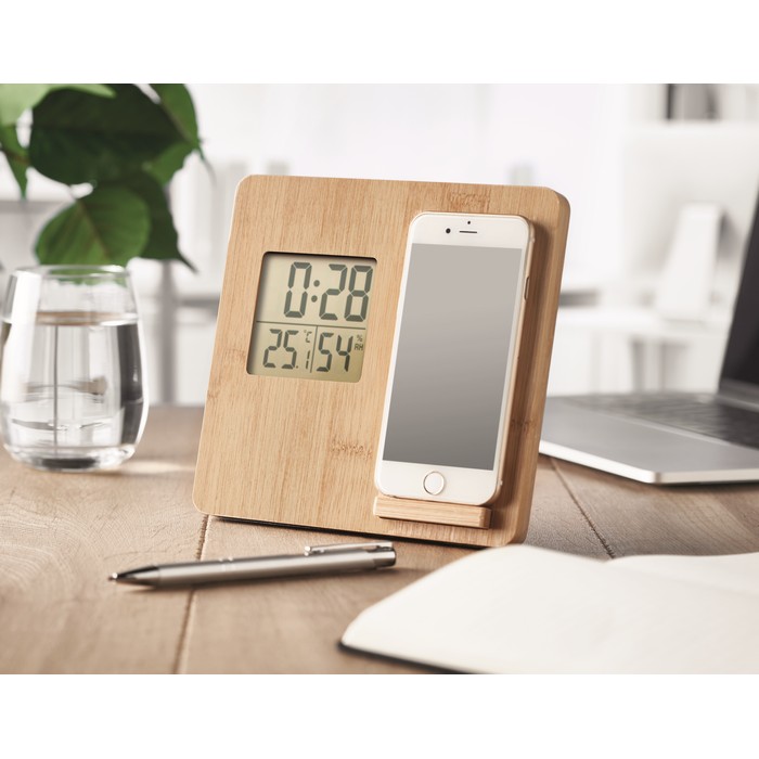 10W Wireless charger device including time, temperature and humidity display, smartphone stand function in bamboo casing. 1 CR2032 included. Wireless output: DC 9V/1.10A (10W) for quick charging. Compatible latest androids, iPhone® 8, X and newer.