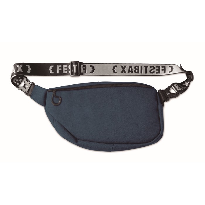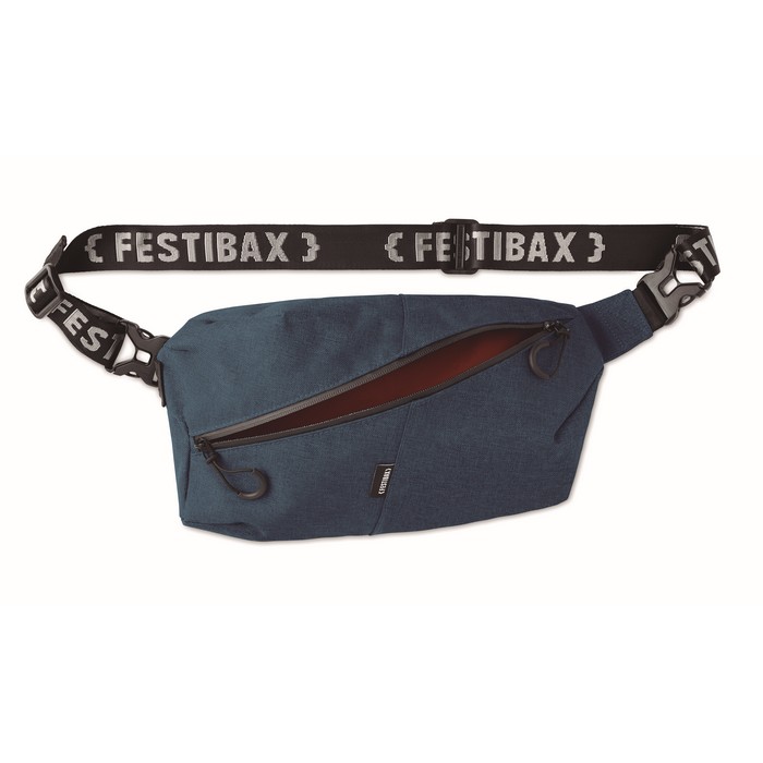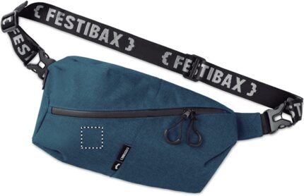 Festibax® Basic. 300D 2 tone cationic dyed polyester with waterproof zipper and detachable and adjustable strap. Including a front and back anti-theft compartment. The ultimate festival bag.