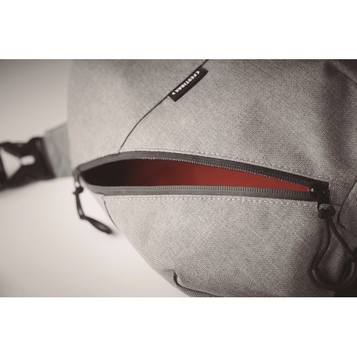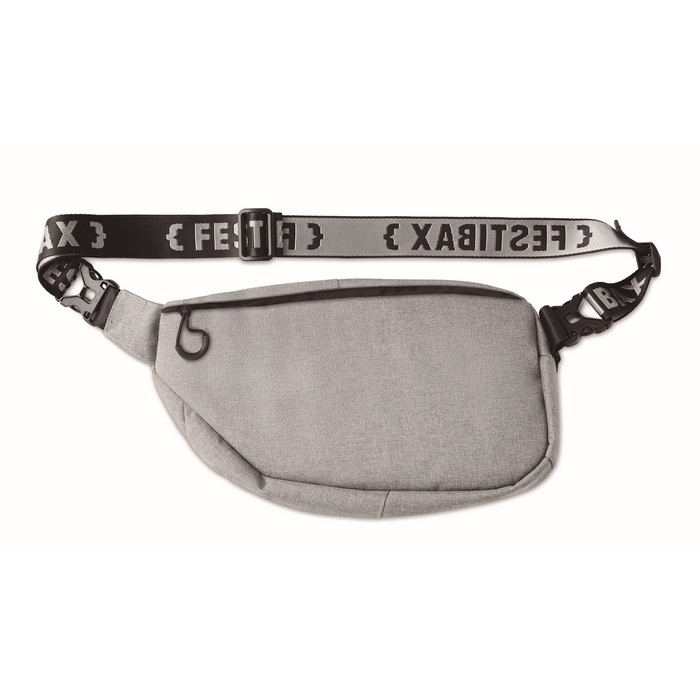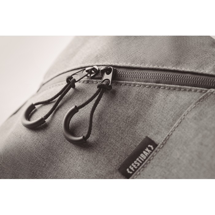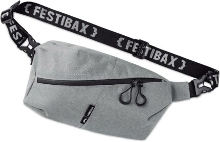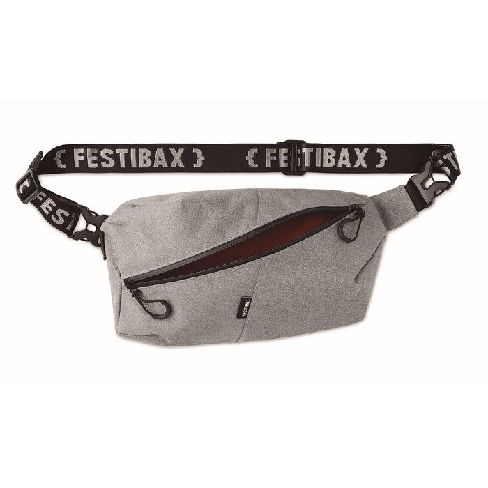 Festibax® Basic. 300D 2 tone cationic dyed polyester with waterproof zipper and detachable and adjustable strap. Including a front and back anti-theft compartment. The ultimate festival bag.