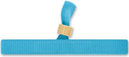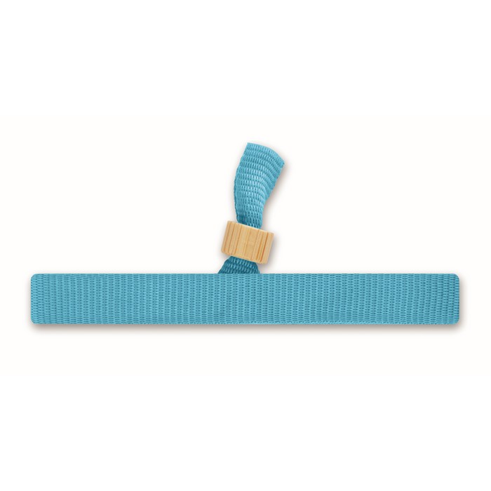 300D RPET polyester event wristband with bamboo ring closure. Wristband size 34 cm and 1,5 cm wide.