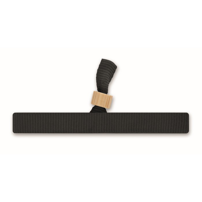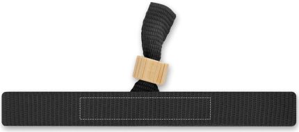 300D RPET polyester event wristband with bamboo ring closure. Wristband size 34 cm and 1,5 cm wide.