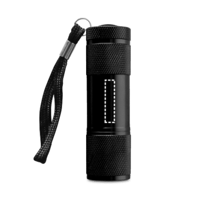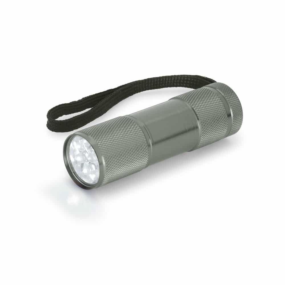 Aluminum flashlight with 9 LEDs and handle. Includes 3 AAA batteries. Available in a wide range of colors. ø26 x 90 mm