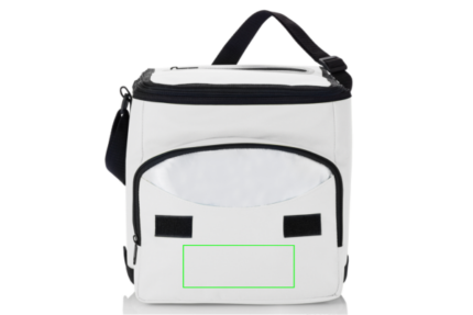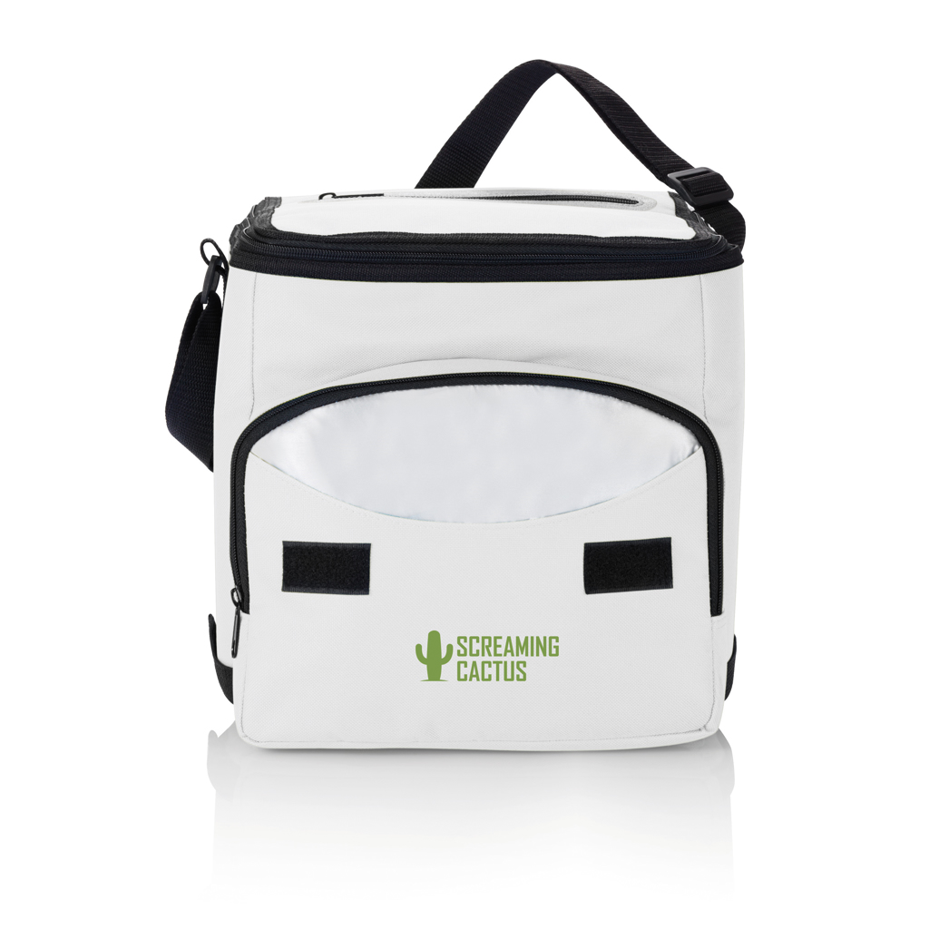 600D cooler bag with silver lined insulation inside to keep all your food and beverages cold. On the front there’s one additional pocket with printed colour detail around the zipper for storing your other belongings.