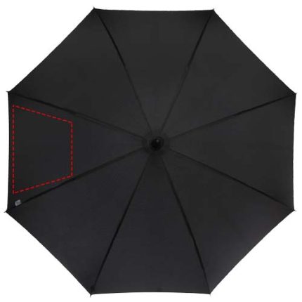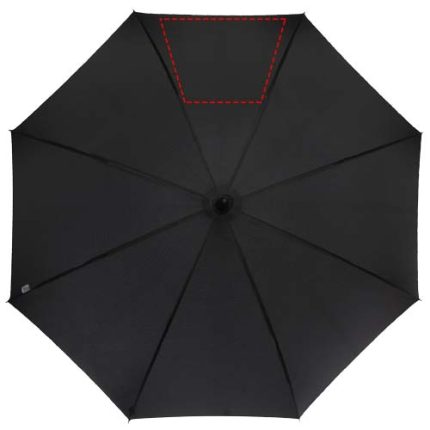 Automatic opening umbrella with a pongee polyester canopy, and a sturdy black plated metal shaft. The high quality full fiberglass frame offers maximum flexibility in windy conditions. Crooked handle with a carbon look finish and black nickel plated tips. Luxe branded details on woven label on the canopy and the closure strap. Large decoration area on each of the panels.