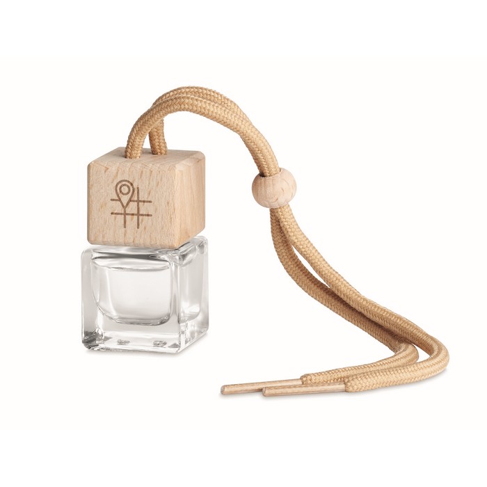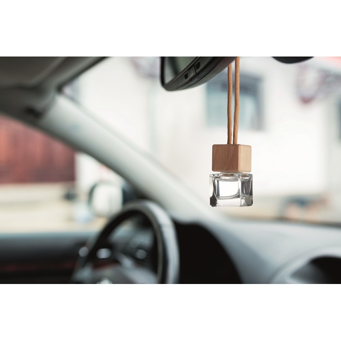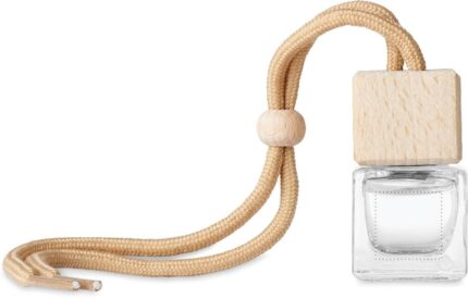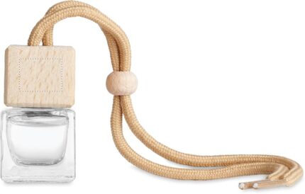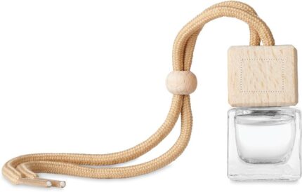 Refillable car air freshener with new car fragrance diffuser with essential oils. Glass container with beech wood lid. Capacity 5 ml.